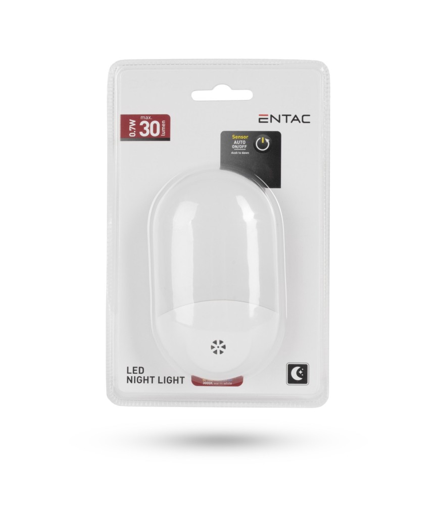 Az Entac Night Light 0,7W egy praktikus és energiatakarékos éjjeli fény, amelyet kifejezetten otthoni használatra terveztek. Beépített dusk-to-dawn szenzorának köszönhetően automatikusan érzékeli a környezeti fényt, és ennek megfelelően kapcsol be vagy ki. Ez a funkció ideális megoldást nyújt azok számára, akik éjszaka kellemes, diszkrét fényt szeretnének, például hálószobában, gyerekszobában vagy folyosón.