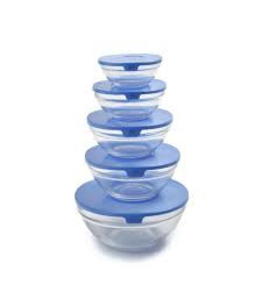Üvegtál készlet műanyag tetővel, 5 darabos, különböző méretűek.