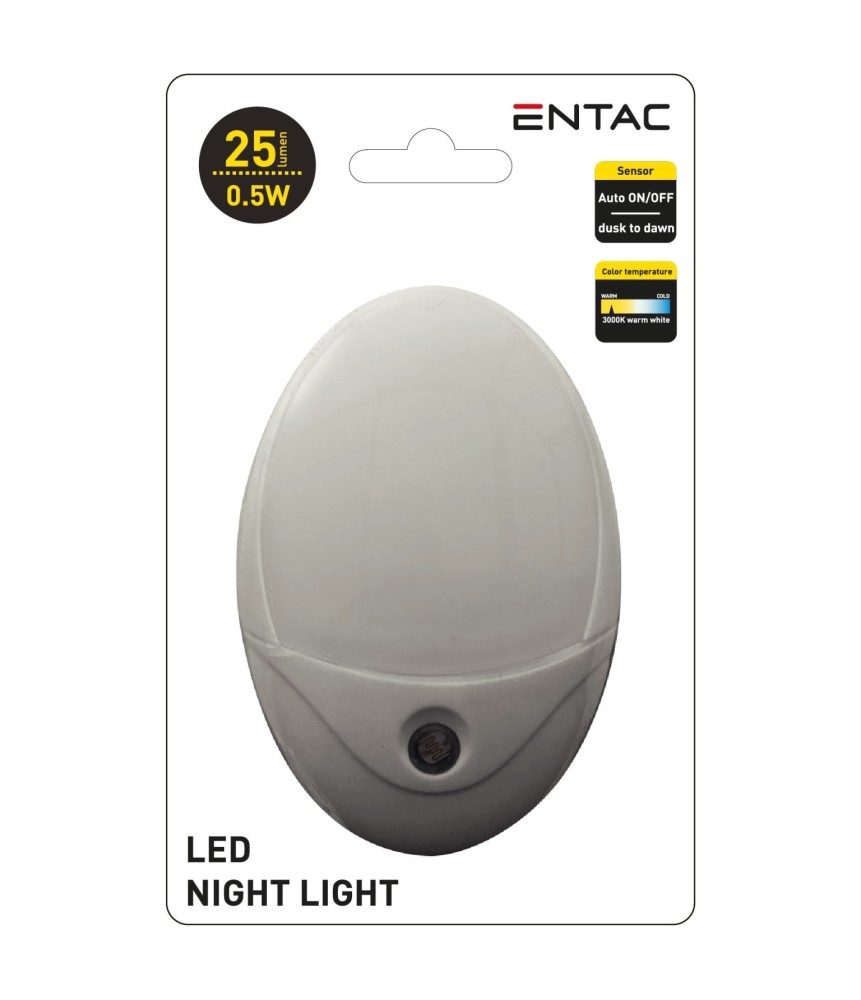 Lépjen fel az éjszakai sötétség ellen az Entac éjjeli fényeivel! Gyerekszobák, sötét folyósók, tökéletesen megvilágíthatók, az egyenesen áramforrásba helyezhető, éjjeli fényeinkkel, megkönnyítve így a tájékozódást. Válogathat 0,5 W teljesítményű, 25 lumenes éjjeli fényeink közül, hideg (CV) színhőmérsékletek, ovális vagy négyzetes formában. Okos, „Dusk to Dawn” funkciójának köszönhetően nem igényel ki és bekapcsolást, naplementekor magától működésbe lép és napfalkeltekor magától kikapcsol.
